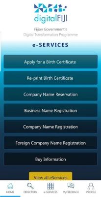 This application is a service provided by the Fijian Government. It offers an integrated mobile application that provides access to the Fijian Government Directory and many other applications to be built on it. It allows a single sign on experience to facilitate interaction with the Fijian government.
